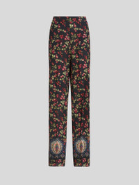Silk crêpe de chine palazzo trousers decorated by a Berry print and ornamental hem. PRODUCT DETAILS • 100% silk • Regular fit with wide leg • Medium waist with elastic • Piped pockets • Button and zip fastening • Made in Italy • The model is 178 cm / 70 inches tall and wears size 40