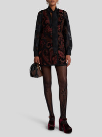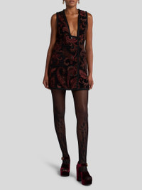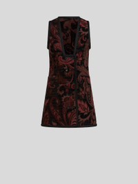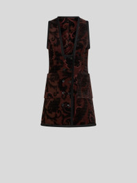 Long, reversible and double-breasted chenille waistcoat with jacquard motif. This model is complete with grosgrain trims. • Slim fit • Geometric neckline • Double-breasted closure • Welt side slip pockets • Made in Italy • The model is 5' 9½" (177 cm) tall and wears a size 40 PRODUCT DETAILS • Exterior: 40% acrylic, 20% cotton, 17% viscose, 15% polyester, 8% modal • Trims: 65% wool, 35% viscose