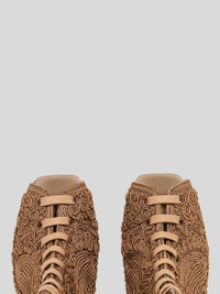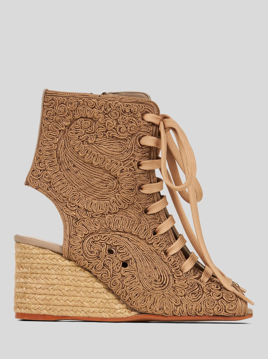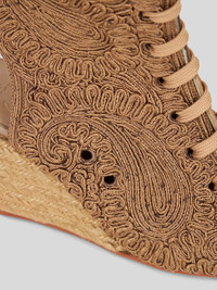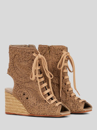 Lace-up peep-toe ankle boots with woven jute wedge and cut-out detail at the back. This model maxi Paisley-patterned Cornely embroidery. • Heel height: 8 cm • Made in Spain PRODUCT DETAILS • Upper: 50% viscose, 40% cotton, 10% polyester • Lining: 100% cowhide