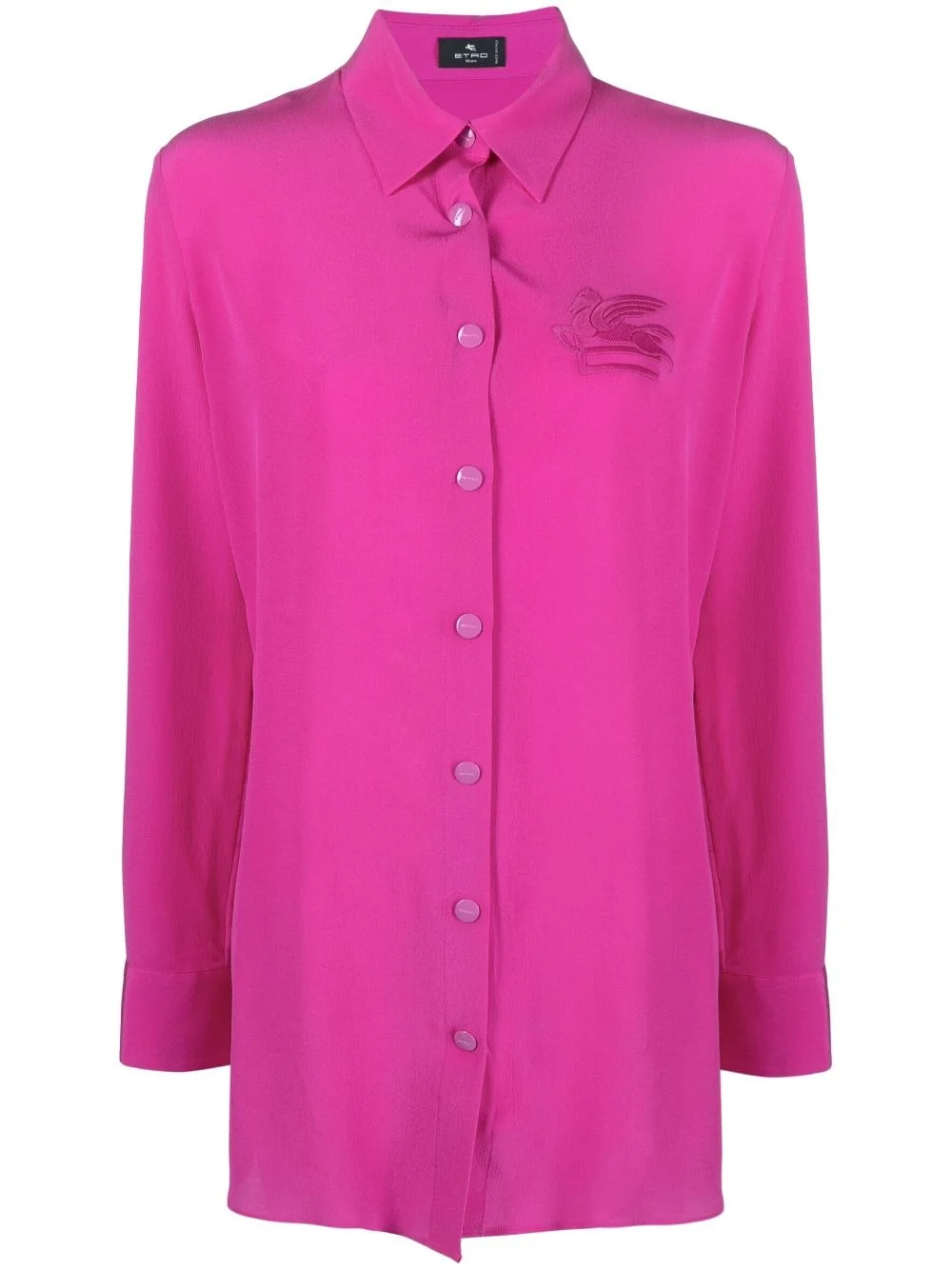 Pegaso-applique silk shirt Highlights - Fuchsia pink - Silk - Applique logo - Front button fastening - Pointed flat collar - Long sleeves - Buttoned cuffs - Curved hem Made in Italy Composition Silk 100% SIZE & FIT Model measurements Height 5 ft 10 in(1.79 m) Bust/Chest 31.1 in(79 cm) Hips 35.03 in(89 cm) Waist 24.01 in(61 cm) Measurement LENGTH 31.1 in(79 cm) FittingInformation Designed to be unstructured, offering a loose fit throughout Made from a lightweight non-stretch fabric This piece fits true to size – take your usual size Washing instructions Dry Clean Only