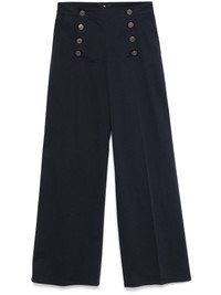 Pegaso-buttons trousers Highlights - Navy blue - Front button fastening - Two side slash pockets - Pressed crease - Straight hem Imported Composition Cotton 97%, Elastane 3% SIZE & FIT Model measurements Height 5 ft 9 in(1.75 m) Bust/Chest 34.64 in(88 cm) Hips 36.61 in(93 cm) Waist 26.37 in(67 cm) FittingInformation Designed with a wide-leg cut, these trousers allow for a close fit at the waist and offer a loose and roomy fit over the leg Made from a midweight stretch fabric, this piece offers elasticity and flexibility when worn