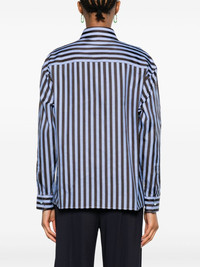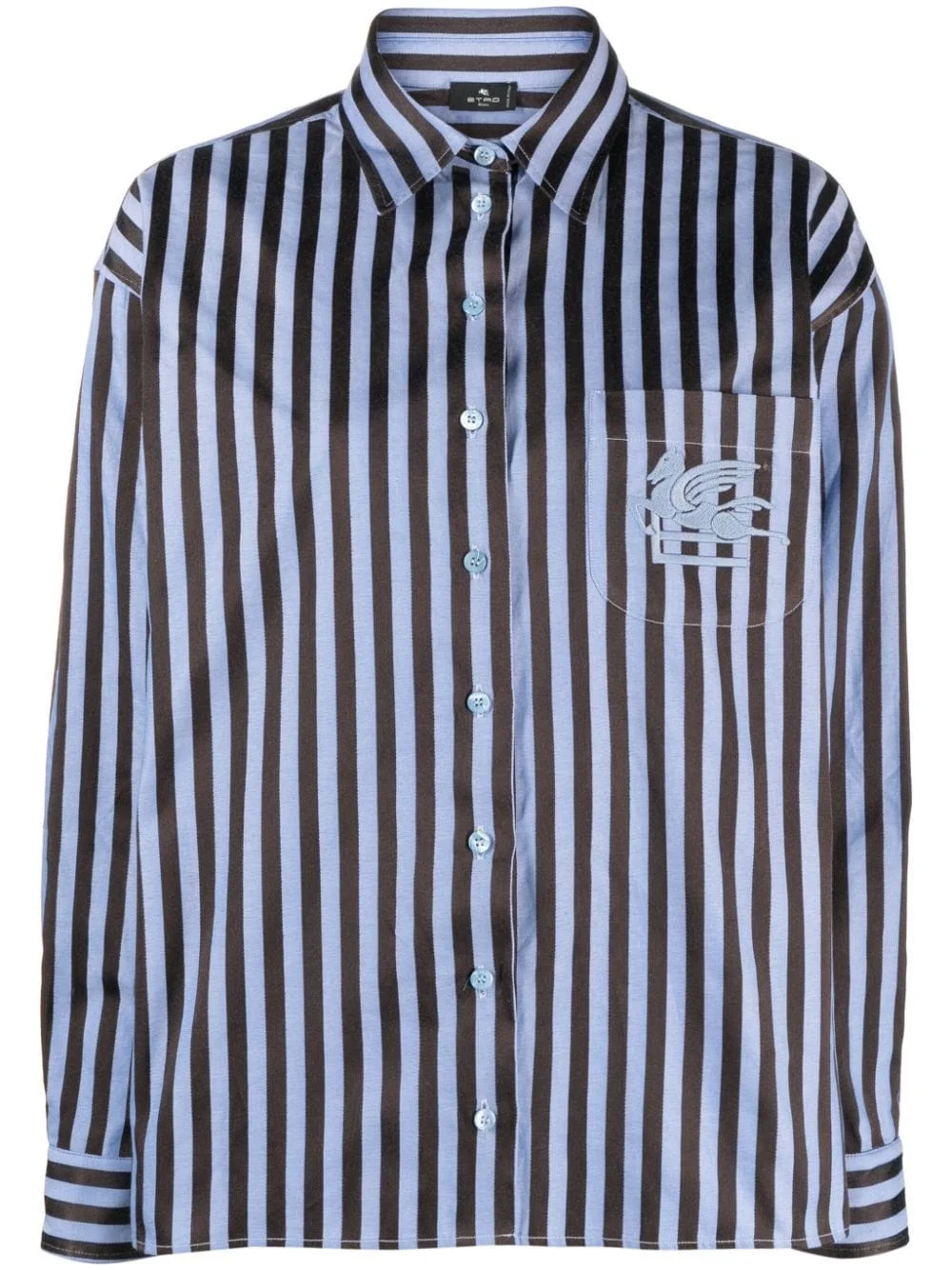 Pegaso-embroidered striped shirt Highlights - Navy blue/light blue - Cotton-silk blend - Satin finish - Vertical stripe pattern - Signature pegaso motif - Classic collar - Front button fastening - Long sleeves - Buttoned cuffs - Straight hem Made in Italy Composition Cotton 70%, Viscose 27%, Silk 3% SIZE & FIT Model measurements Height 5 ft 11 in(1.8 m) Bust/Chest 31.88 in(81 cm) Hips 35.03 in(89 cm) Waist 24.01 in(61 cm) FittingInformation Designed to be unstructured, offering a loose fit throughout Made from a midweight non-stretch fabric This piece fits true to size – take your usual size Washing instructions Dry Clean Only