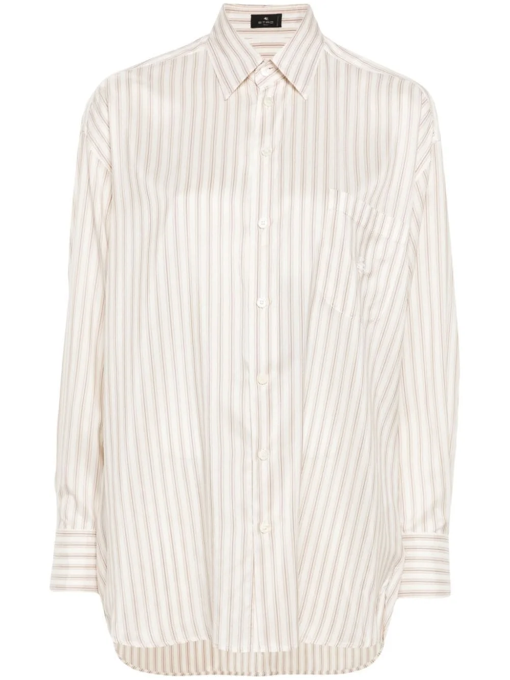 Pegaso-embroidered striped shirt Highlights - White/multicolour - Silk - Satin finish - Vertical stripe pattern - Classic collar - Long sleeves with buttoned cuffs - Pleat detailing to the sleeve - Chest patch pocket - Embroidered signature pegaso motif at the chest - Curved hem with hem gusset - Front button fastening Made in Italy Composition Silk 100% SIZE & FIT Model measurements Height 5 ft 11 in(1.8 m) Bust/Chest 32.67 in(83 cm) Hips 35.82 in(91 cm) Waist 25.98 in(66 cm) FittingInformation Designed to be unstructured, offering a loose fit throughout Made from a lightweight non-stretch fabric This piece fits true to size – take your usual size