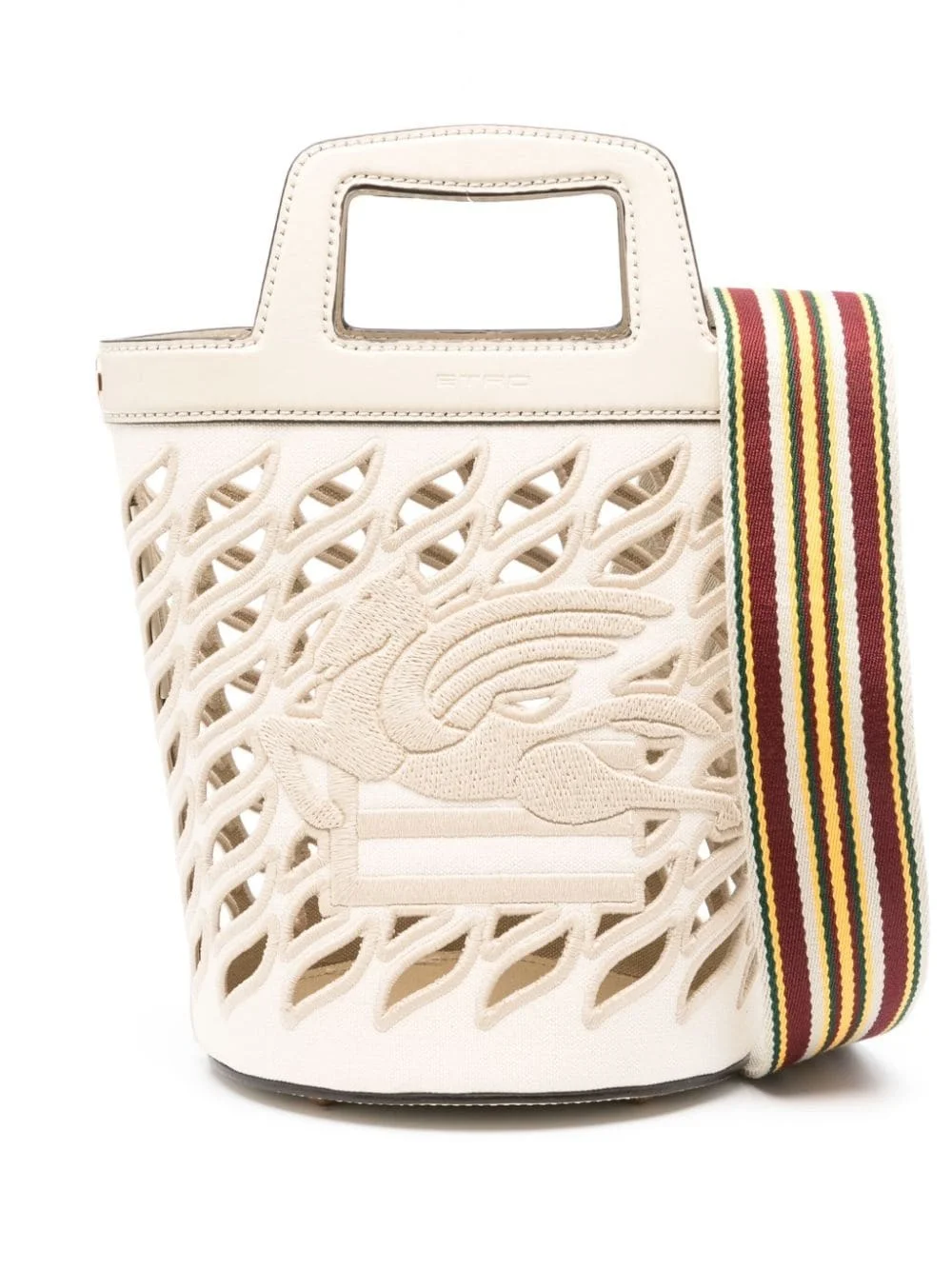 Pegaso-motif bucket bag Highlights - Light beige - Calf leather - Canvas - Panelled design - Tonal stitching - Bucket body - Embroidered design - Cut-out detailing - Detachable striped shoulder strap - Two top handles - Debossed logo to the front - Embroidered signature pegaso to the front - Metal feet - Main compartment - Internal embroidered logo - Unlined - Gold-tone hardware - Lobster claw fastening to the top - This piece comes complete with a protective dust bag. Made in Italy Composition Outer: Calf Leather 100%, Canvas 100% SIZE & FIT Model measurements Height 5 ft 8 in(1.73 m) Bust/Chest 29.92 in(76 cm) Hips 33.07 in(84 cm) Waist 23.22 in(59 cm) Measurement DEPTH 6.49 in(16.5 cm) HANDLE 1.57 in(4 cm) HEIGHT 8.66 in(22 cm) WIDTH 42.12 in(107 cm) MINIMUM WIDTH 6.69 in(17 cm) STRAP 8.46 in(21.5 cm)