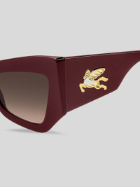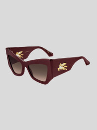 A powerful fashion statement – these sunglasses embrace the mood of ETRO's latest runway show. The striking angular shape is crafted from premium acetate, available in black, burgundy and the distinctive Paisley pattern. Notice the innovative construction of the temples, combining a subtle milled effect with a one-piece metal trim depicting the mythical Pegasus. The iconic end tips and logo lettering on the tinted lenses complete this daring pair. • Lenses with UVA and UVB protection • Fitting: International • Lenses: 1.71 inches (43,5 mm) , Bridge: 0.79 inches (20 mm), Temples: 5.51 inches (140 mm) • Made in Italy PRODUCT DETAILS • Frame: 100% acetate