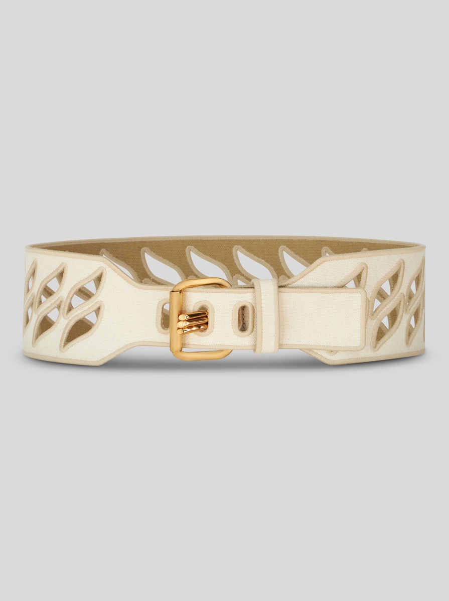 Perforated cotton canvas belt with adjustable three-pronged buckle. PRODUCT DETAILS • 100% cotton • Embroidery: 100% polyester • Golden-finish metal accessories • Made in Italy