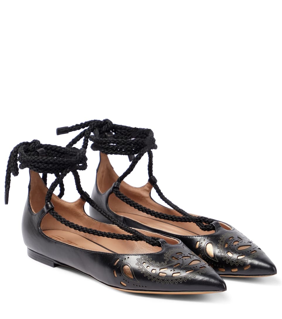 Bring Etro’s free-spirited aesthetic into your footwear roster with these leather ballet flats. They’re distinguished by braided rope straps that wrap elegantly around the ankles and perforated paisley motifs at the pointed-toe profiles. Product Details - Lining: leather - Sole: leather insole and sole - Upper: lamb leather - Toe shape: pointed toe - Comes with a box - Designer color name: 1 - Made in Italy - Item number: P00739321 Size & Fit - True to size - Half sizes please take the next size down - European sizes - 1,5cm-0.5" heel (size EU 38)
