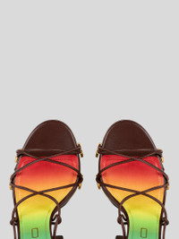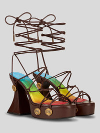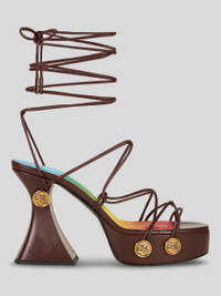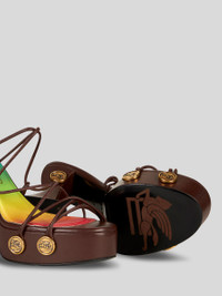 Leather platform sandals with thin straps and multicoloured insole. The model features studs with an engraved Pegaso symbol and ETRO logo. PRODUCT DETAILS • Upper: 100% leather • Heel: 100% leather • Sole: 100% leather • Studs: 100% brass • Heel height: XX cm • Made in China