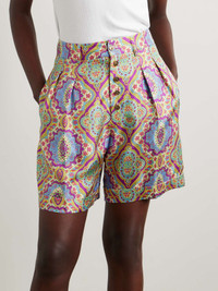 EDITORS'NOTES Etro's shorts are printed with a colorful, ornate motif that features bright blossoms and geometric shapes. Tailored from lustrous silk-twill, they have inverted pleats for subtle volume and gold-tone buttons carved with the label's iconic 'Pegaso' logo. SIZE & FIT - Fits true to size, take your normal size - High-rise, cut for a boxy fit - Lightweight, fluid, non-stretchy fabric - Model is 180cm/ 5’11” and is wearing an IT 40 DETAILS & CARE - Multicolored silk-twill - Button fastenings along front - 100% silk; lining: 100% viscose - Dry clean