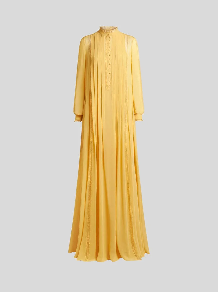 Long pleated dress in pure silk georgette. This model features tone-on-tone inlaid lace detailing and comes with a petticoat. • Loose fit • Mandarin collar with lace insert • Long sleeves • Button closure • Made in India • The model is 5' 9½" (177 cm) tall and wears a size 40 PRODUCT DETAILS • 100% silk • Details: 100% nylon • Slip: 100% viscose