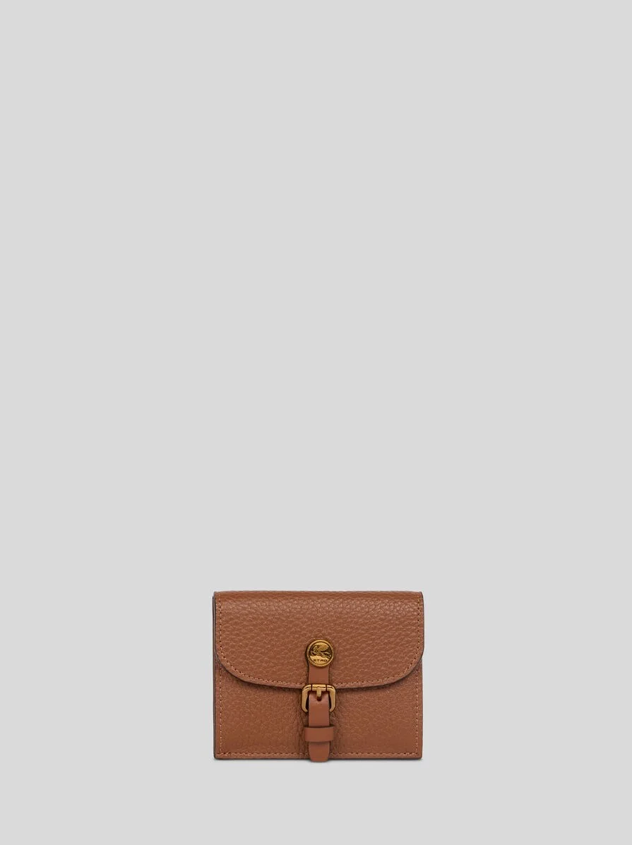 Small Pony card holder in plain-coloured tumbled leather. This accessory, presented at the Women's Autumn-Winter 25 Runway Show, features press-stud closure on the inside, covered by a decorative metal buckle with strap and loop on the outside, and is complete with a minted coin with the ETRO logo and Pegaso symbol. • Dimensions (Width, Height): 4.1 x 3.3 inches (10.5 x 8.5 cm) • Fastened with press stud, strap and loop • Three card slots • Coin pocket • Made in Italy PRODUCT DETAILS • Exterior: calfskin • Lining: 100% nylon