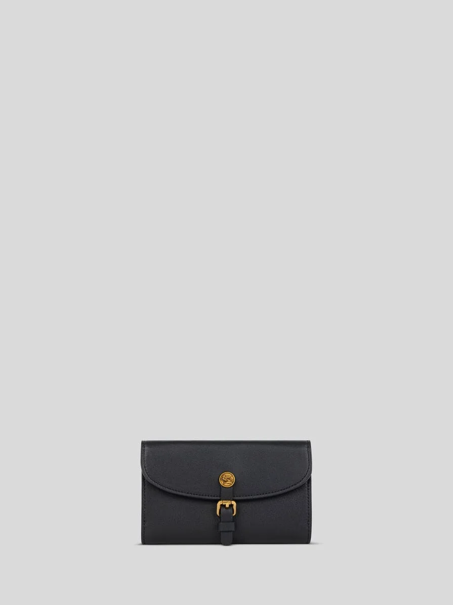 Pony wallet in plain-coloured leather. This accessory, presented at the Autumn-Winter 25 Runway Show, features press-stud closure on the inside, covered by a decorative metal buckle with strap and loop on the outside, and is complete with a minted metal coin with the ETRO logo and Pegaso symbol. • Dimensions (Width, Height): 5.9 x 3.5 inches (15 x 9 cm) • Fastened with press stud, strap and loop • Ten card slots • Banknote compartment • Golden-finish metal details • Made in Italy PRODUCT DETAILS • Calfskin