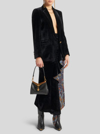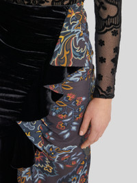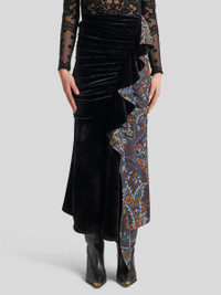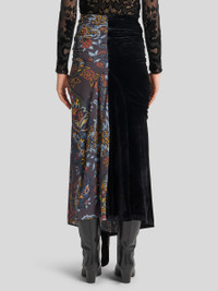Midi skirt with draped effect and maxi ruche detailing. This model is made from plain-coloured silk-blend velvet and features a stretch sable insert with a decorative floral Paisley print. PRODUCT DETAILS • Plain-coloured fabric: 80% viscose, 20% silk • Patterned fabric: 97% viscose, 3% elastane • Lining: 100% polyester