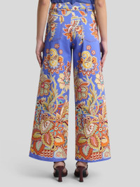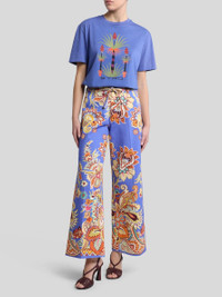Culotte jeans with legs that flare out at the bottom, high waist and detachable belt. This model is made from stretch cotton denim embellished with a placed floral print. • Regular fit • High waist • Patch pockets on the back • Pegaso button and zip closure • Made in Italy • The model is 5' 9½" (177 cm) tall and wears a size 26 PRODUCT DETAILS • 97% cotton, 3% elastane