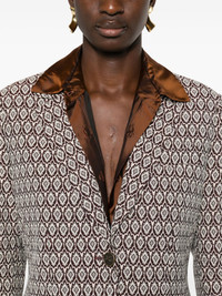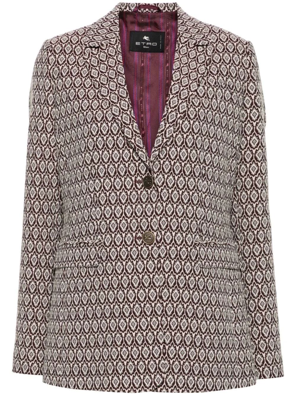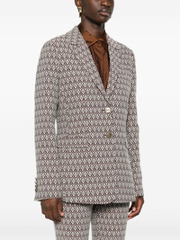 jacquard blazer Highlights - Coffee brown/multicolour - Cotton blend - Patterned jacquard - Logo-embossed buttons - Notched lapels - Front button fastening - Drop shoulder - Long sleeves - Buttoned cuffs - Chest welt pocket - Two front flap pockets - English rear vents - Curved hem - Striped lining Made in Italy Composition Outer: Cotton 59%, Polyester 20%, Nylon 19%, Elastane 2% Lining: Viscose 52%, Acetate 48% SIZE & FIT Model measurements Height 5 ft 10 in(1.77 m) Bust/Chest 32.28 in(82 cm) Hips 35.03 in(89 cm) Waist 25.19 in(64 cm) FittingInformation Designed for a slim fit that sits just away from the body offering a close yet comfortable fit The internal shoulder pads offer a structured shape Made from a midweight fabric This piece fits true to size – take your usual size