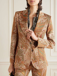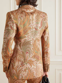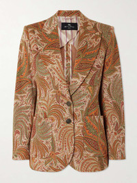 EDITORS'NOTES Etro's paisley has been a brand signature since 1981 and this jacquard-knit blazer is decorated with the artful motif in earthy tones of brown and burnt-orange. Make the strongest statement by wearing it with the matching pants. SIZE & FIT Model measurements: - Fits true to size, however those who are between sizes should take the smaller size - Tailored for a slim fit - Mid-weight, slightly stretchy fabric - Model is 180cm/ 5'11" and is wearing an IT 38 - Bust: 81cm/ 32" - Waist: 63cm/ 25" - Hip: 91cm/ 36" DETAILS & CARE - Multicolored jacquard-knit - Button fastenings through front - 54% polyester, 21% viscose, 21% cotton, 3% polyamide, 1% elastane - Dry clean