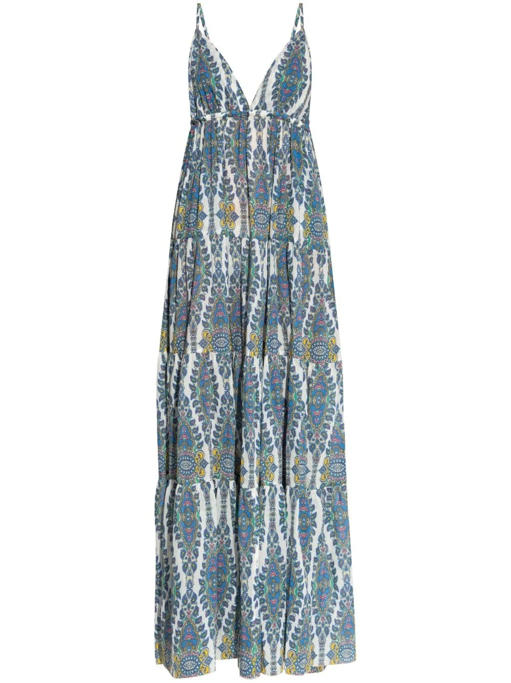 printed maxi dress Highlights - Sky blue - Slip-on style - Crossover shoulder straps - Sleeveless - Tiered skirt Made in Italy Composition Cotton 78%, Silk 22% SIZE & FIT Measurement HIPS 46.45 in(118 cm) LENGTH 57.48 in(146 cm) WAIST 34.64 in(88 cm) Washing instructions Read Manufacturer Guidelines
