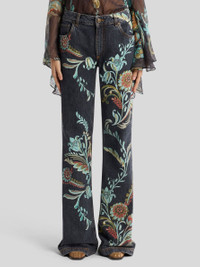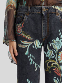 Five-pocket jeans with snug fit at the sides, flared hems and placed daffodil print. Made from cotton denim, this piece is enhanced by a metal button with a raised Pegaso and a rear label sporting the ETRO logo and Pegaso symbol. The item was presented at the Autumn-Winter 25 Runway Show. • Regular fit • Regular waist • Five pockets • Belt loops • Concealed zip and Pegaso button closure • Rear label with ETRO logo and Pegaso • Made in Italy • The model is 5' 9½" (176 cm) tall and wears a size 26 PRODUCT DETAILS • 100% cotton