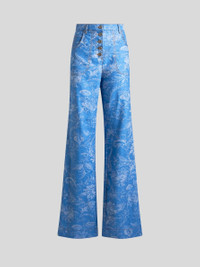 Flared-leg jeans in slightly stretchy cotton- and linen-blend denim with all-over floral jacquard motif. This five-pocket pair is fastened with metal buttons embellished with the Pegaso logo. • Regular fit • High waist • Five-pocket model • Fastened with Pegaso buttons • Made in Italy • The model is 5' 9½" (176 cm) tall and wears a size 26 PRODUCT DETAILS • 62% cotton, 37% linen, 1% elastane
