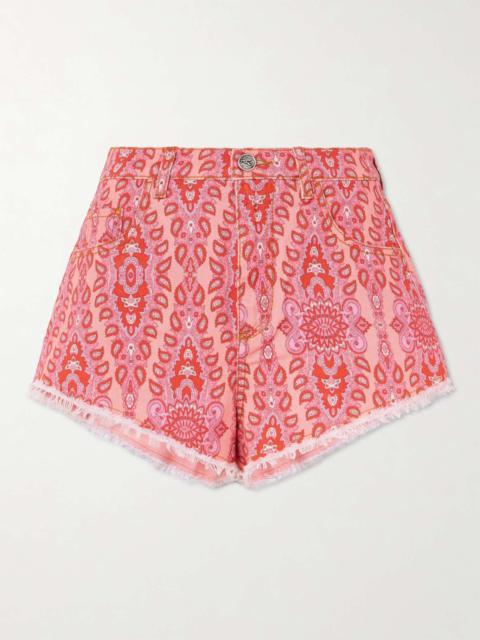 Frayed paisley-print denim shorts