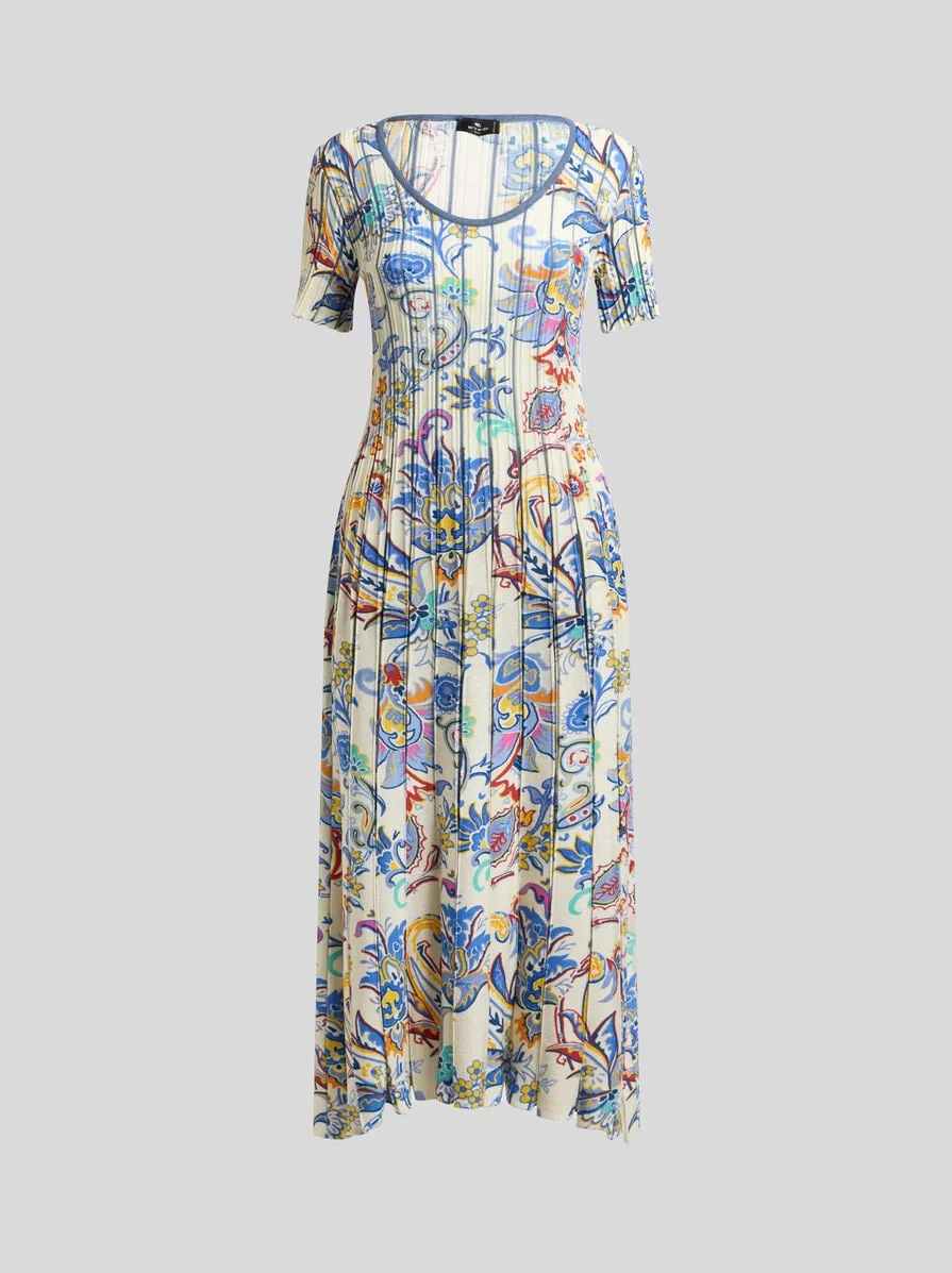 Slightly flared midi dress in knit cotton-blend fabric. This model features a decorative all-over floral print and contrasting plain-coloured pleats. • Regular fit • Round neck • Short sleeves • Made in Italy • The model is 5' 9½" (177 cm) tall and wears a size 40 PRODUCT DETAILS • 43% cotton, 29% viscose, 28% polyester