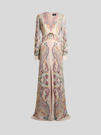 Long stretch sable dress with placed floral Paisley print. This model also features a plunging V-neck and front slit. • Regular fit • V-neck • Roomy sleeves • Rear zip closure • Made in Italy • The model is 5' 9½" (177 cm) tall and wears a size 40 PRODUCT DETAILS • 97% viscose, 3% elastane • Lining: 100% polyester