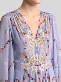 Long dress in pure silk georgette embellished with placed floral print. This relaxed-fit model is enhanced by shiny lurex details and features a belt that ties into a knot. • Regular fit • V-neck • Wide long sleeves • Made in Italy • The model is 5' 9½" (177 cm) tall and wears a size 40 PRODUCT DETAILS • 98% silk, 2% metallised fibre • Lining: 100% polyester