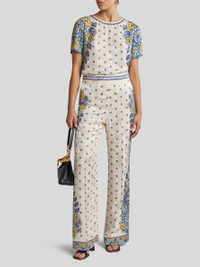 Palazzo trousers in silk-blend fabric with pressed creases, refined jacquard rose motif and floral print. The garment also features a decorative, placed medallion motif at the sides and a contrasting pattern at the bottom of the legs and two waistbands. • Loose fit • Regular waist • Waistband elasticated at the back • Made in Italy • The model is 5' 9½" (177 cm) tall and wears a size 40 PRODUCT DETAILS • 65% viscose, 35% silk