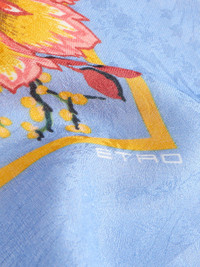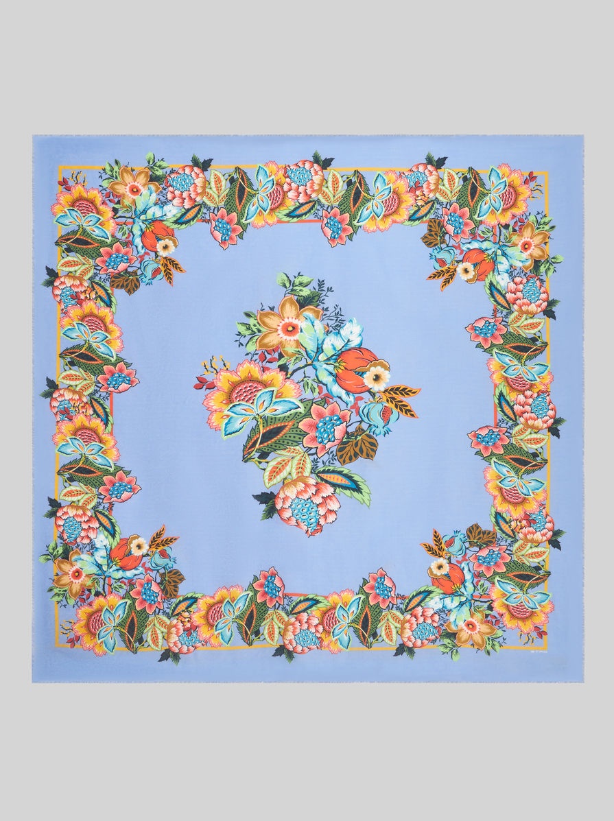 Tone-on-tone cotton and modal jacquard shawl with multicoloured bandanna bouquet-inspired print. Small fringe-trimmed edges. PRODUCT DETAILS • 140 x 140 cm / 55.11 x 55.11 inches • 53% cotton, 47% modal • Made in Italy