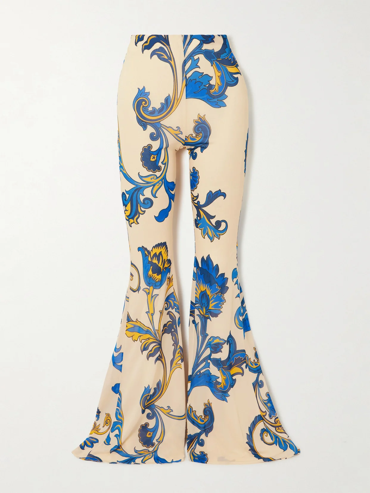 Etro's Spring '25 collection is inspired by the Mediterranean. Made from jersey, these pants are printed with abstract flowers and swirls that nod to the label's signature paisley motif. They sit high on the waist and have generous flared cuffs. Take cues from the show's styling and team yours with thong sandals.