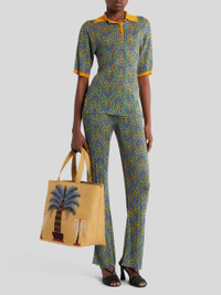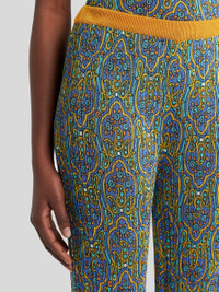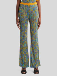 Slightly flared knit trousers. This model features an all-over abstract print and a contrasting elasticated band. PRODUCT DETAILS • 100% viscose
