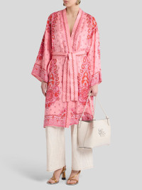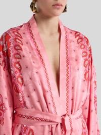 Long Kesa robe in silk-blend fabric with chiffon lining. This model features a decorative printed pattern against a striking tone-on-tone rose jacquard motif. • Kimono sleeves • Fastened with belt • Made in Italy • The model is 5' 9½" (177 cm) tall and wears a size S PRODUCT DETAILS • 65% viscose, 35% silk • Lining: 100% silk