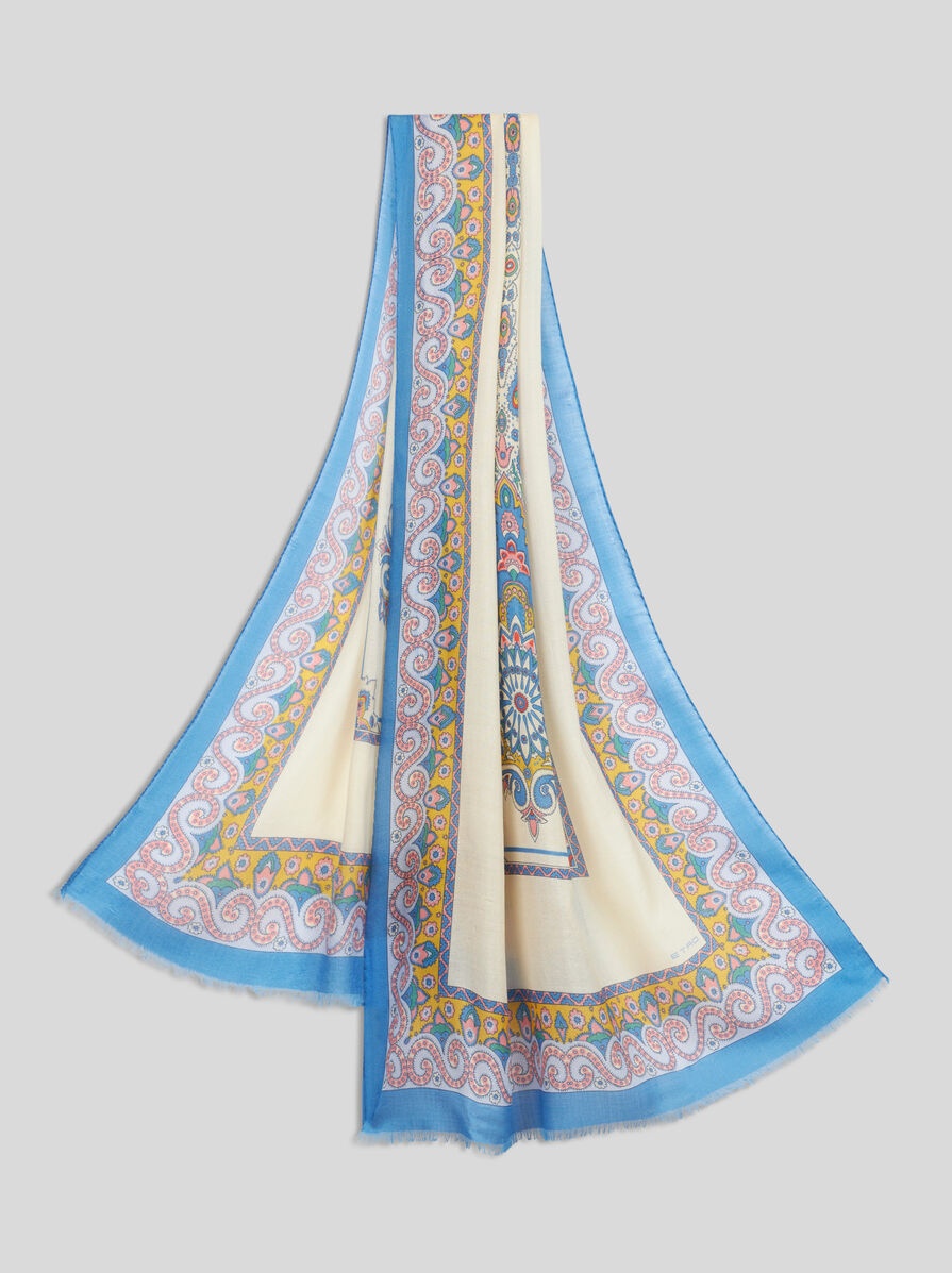 Cashmere-, silk- and wool-blend scarf with medallion and mini Paisley print and floral-style geometric micro pattern along the edges. Completing the accessory are the slightly frayed short sides and an ETRO logo in the corner. • Size: 27.6 x 66.9 inches (70 x 170 cm) • Made in Italy PRODUCT DETAILS • 40% cashmere, 30% silk, 30% wool