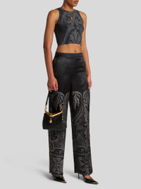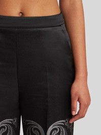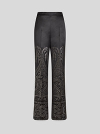 Palazzo trousers with a wide straight leg and pressed crease. This silk-blend jacquard model features a placed floral paisley design with an ornamental trim. PRODUCT DETAILS • 54% silk, 46% polyester