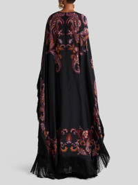 Long silk dress with cape detail and placed print. This model is complete with tone-on-tone fringes at the sleeves and hem. • Loose fit • Crewneck with buttoned keyhole • Made in Italy • The model is 5' 9½" (177 cm) tall and wears a size 40 PRODUCT DETAILS • 100% silk • Fringe details: 100% acetate