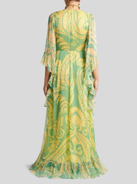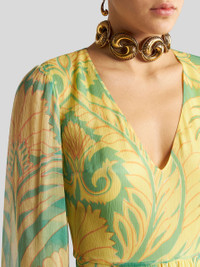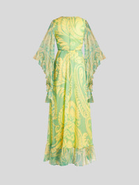 Long dress with V-neck, wide sleeves and flowing skirt with small flounce at the bottom. This model is made from lightweight silk crepon with an Angkor print. PRODUCT DETAILS • 100% silk • Lining: 100% polyester