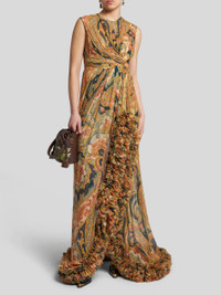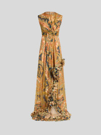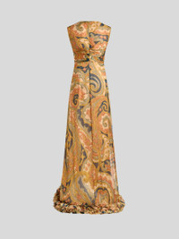 Long dress in lightweight silk crepon with all-over print. This model features maxi-ruched detailing. • Regular fit • Crew neck • Rear zip closure • Made in Italy • The model is 5’9” (176 cm) tall and wears a size 40 (IT) PRODUCT DETAILS • 100% silk • Embellishment: 100% polyester • Embroidery: 100% polyester