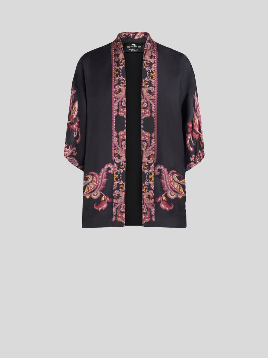 Short silk twill kesa robe with decorative placed print. • Kimono sleeves • Made in Italy • The model is 5' 9½" (177 cm) tall and wears a size S PRODUCT DETAILS • 100% silk