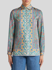 Straight-cut shirt in pure silk twill embellished with stylised, multicoloured Paisley print all over. The collar, bottom and middle of the garment, on the other hand, feature a decorative, contrasting-colour motif. • Slim fit • Spread collar • Long sleeves • Working cuffs • Branded-button closure • Yoke with inverted pleat on the back • Made in Italy • The model is 5' 9½" (177 cm) tall and wears a size 40 PRODUCT DETAILS • 100% silk