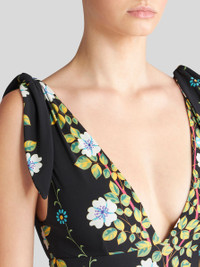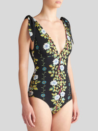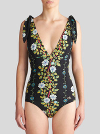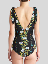 One-piece swimsuit with bows on the shoulders and decorative placed floral print. PRODUCT DETAILS • 72% polyamide, 28% elastane • V-neck • Made in Italy • The model is 178 cm/ 70.07 inches tall and wears a size 40 (IT)