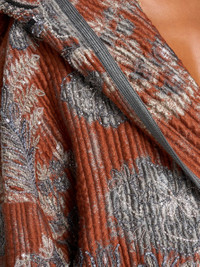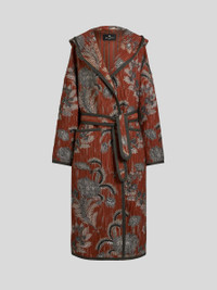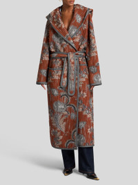 Quilted jacquard coat with a floral foliage design decorated with beads and embroidered sequins. This model features piping on the trims. • Loose fit • Hood • Fastened with matching belt • Side slip pockets • Made in Italy • The model is 5’10” (178 cm) tall and wears a size 40 (IT) PRODUCT DETAILS • 34% polyester, 25% wool, 25% acrylic, 7% silk, 5% metal fibres, 4% polyamide • Ribbon: 100% acetate • Embellishments: Acrylic/Glass • Lining: 52% viscose, 48% acetate