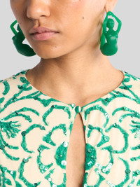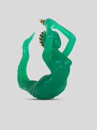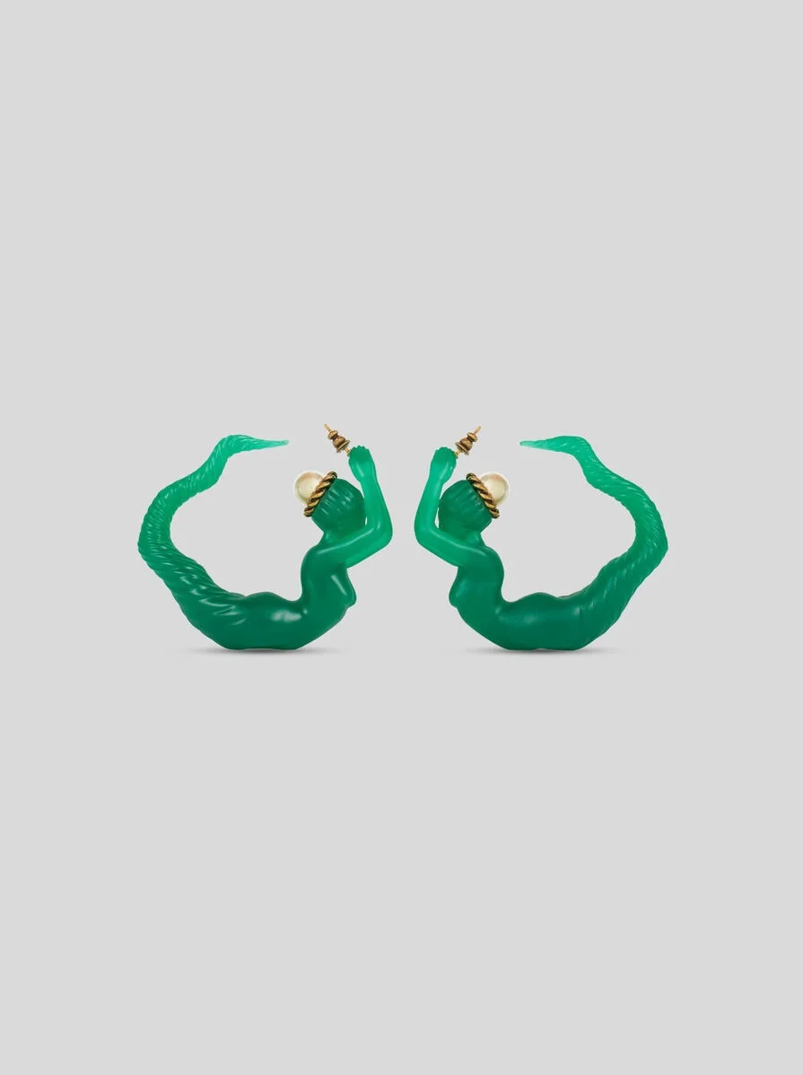 Mermaid-style resin earrings finished with pearl and woven brass details. The accessory was presented at the Spring-Summer 25 Women's Runway Show. • Made in Italy PRODUCT DETAILS • Body: 100% resin • Appliques: 50% plastic, 50% brass