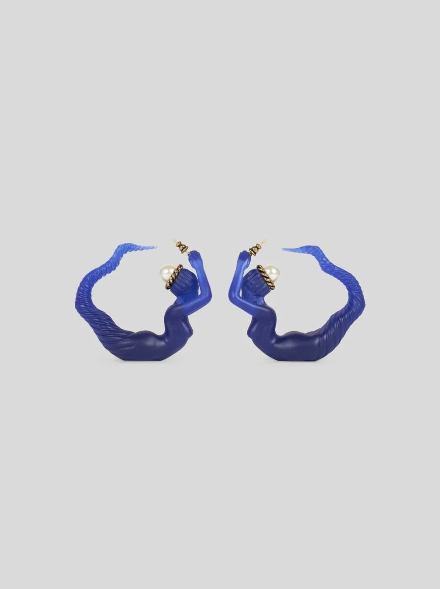 Mermaid-style resin earrings finished with pearl and woven brass details. The accessory was presented at the Spring-Summer 25 Women's Runway Show. • Made in Italy PRODUCT DETAILS • Body: 100% resin • Appliques: 50% plastic, 50% brass