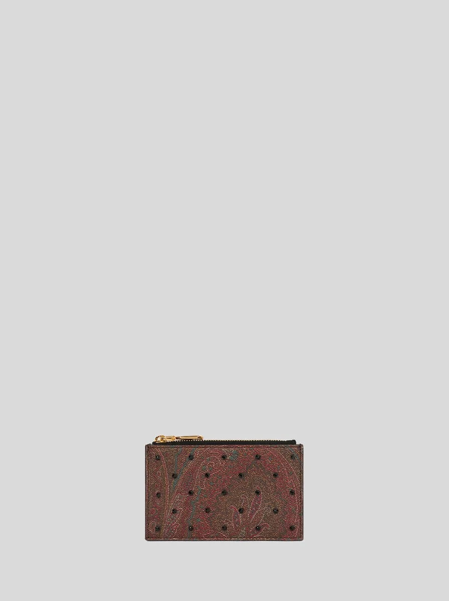 Card holder in iconic Paisley jacquard fabric embellished with rhinestones all over and leather details. The model features a zip closure. • Dimensions (Width, Height): 5.1 x 3.1 inches (13 x 8 cm) • Zip closure • Three card slots • Rhinestones all over • Made in Italy PRODUCT DETAILS • Exterior: Paisley jacquard cotton fabric coated with matt texture and lined with canvas • Coating: 100% PVC • Trims: calfskin • Appliques: 100% crystal • Lining: 100% nylon