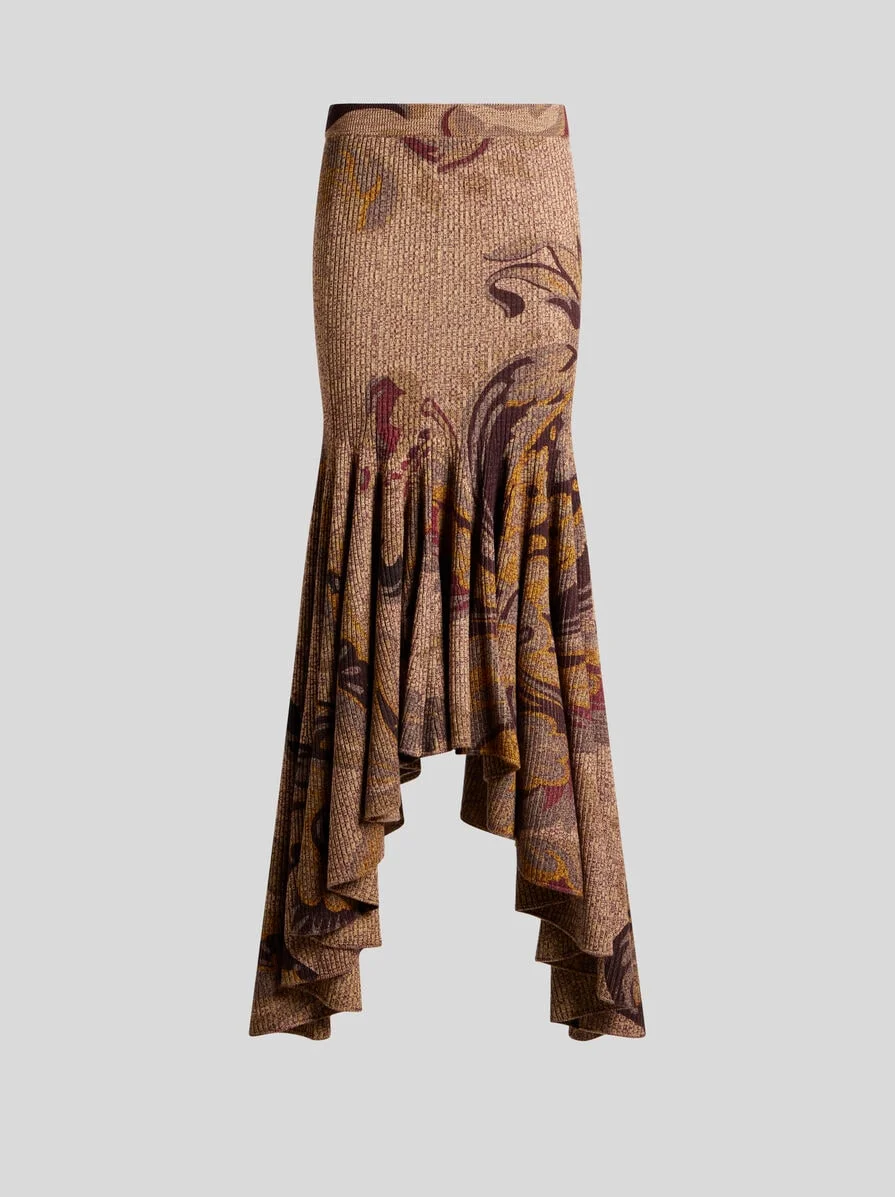 Maxi skirt with snug fit at the sides, flounces at the bottom and asymmetric tips. This model is made from ribbed pure wool fabric and has an all-over floral print. The item was presented at the Autumn-Winter 25 Runway Show. • Slim fit • Elasticated waist • Made in Italy • The model is 5' 9½" (176 cm) tall and wears a size 40 PRODUCT DETAILS • 100% wool