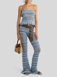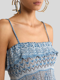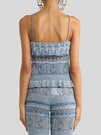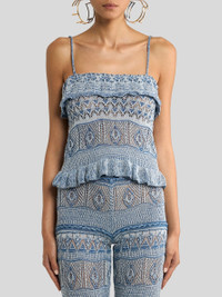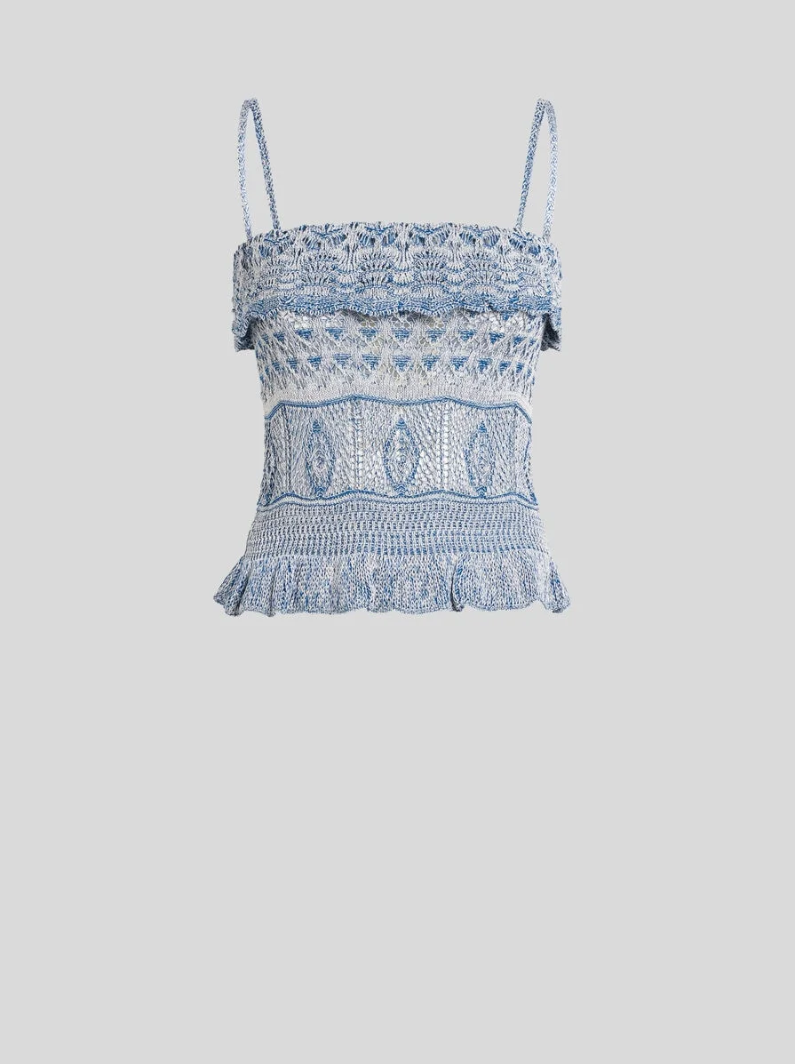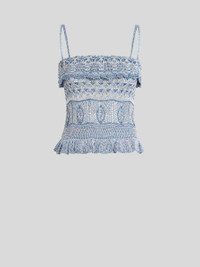 Fitted crop top in crocheted two-tone cotton fabric. Featuring spaghetti straps, this piece stands out for its elaborate openwork featuring geometric and wavy motifs, and is complete with delicate ruffles along the neck and hem. • Fitted • Straight neck • Thin shoulder straps • Made in Italy • The model is 5' 9½" (176 cm) tall and wears a size 40 PRODUCT DETAILS • 99% cotton, 1% polyamide