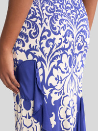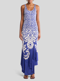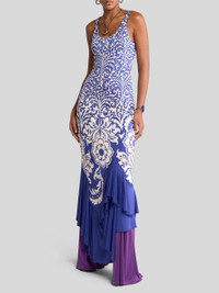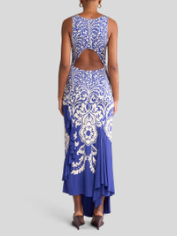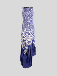Slim-fitting, sleeveless long dress with U-neck and soft, draped-effect flounce at the bottom of the skirt. This item, made from glossy-effect jersey, features a double print in which a palm tree-inspired pattern at the top leads into a contrasting, placed stencil-like floral motif. The cut-out at the rear leaves the lower part of the back open. The item was presented at the Spring-Summer 25 Women's Runway Show. • Slim fit • U-neckline • Sleeveless • Made in Italy • The model is 5' 9½" (177 cm) tall and wears a size 40 PRODUCT DETAILS • 96% viscose, 4% elastane