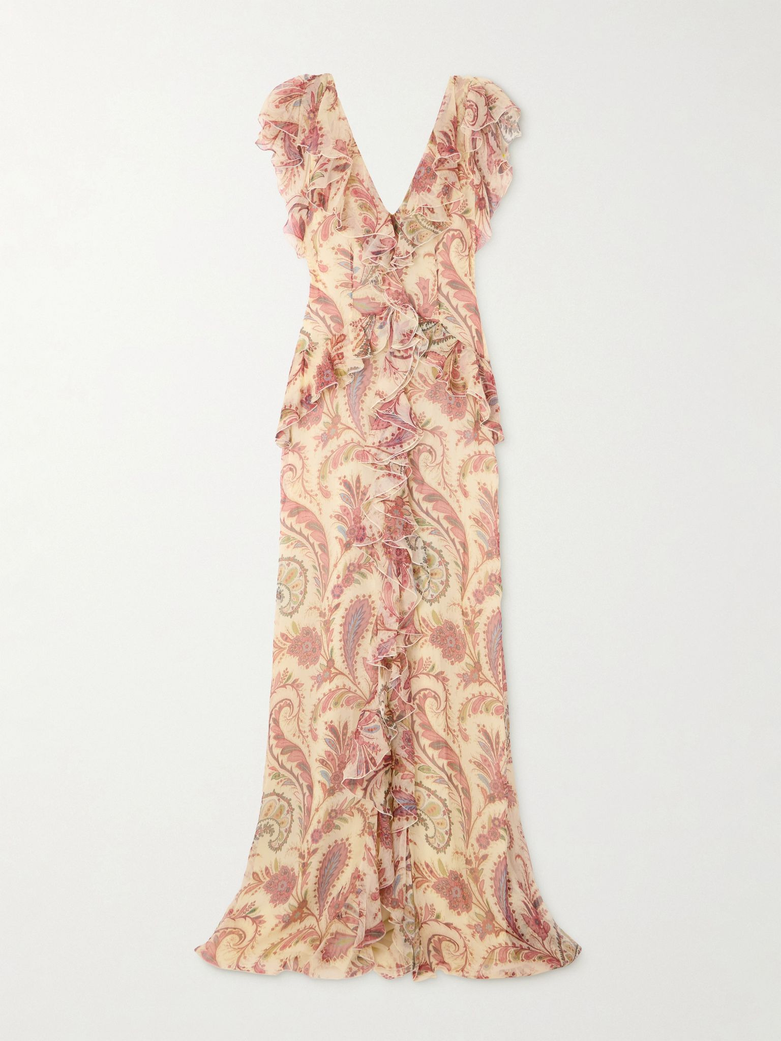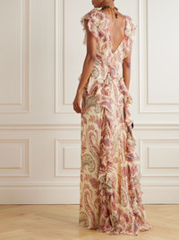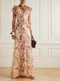 Etro's collections are characterized by a sense of romance. This ruffled maxi dress is cut from airy silk-crepon with a fluid drape and printed with flowers and signature paisley swirls. Opt for heels to lift the floor-sweeping hem just a touch. Size & Fit - Fits true to size, take your normal size - Designed for a slim fit - Lightweight, non-stretchy fabric - Model is 177cm/ 5'10" and is wearing an IT 38 Model measurements: - Bust: 86cm/ 34" - Waist: 65cm/ 25.5" - Hip: 90cm/ 35.5" Details & Care - Multicolored silk-crepon - Concealed hook and zip fastening at side - 100% silk; lining: 100% polyester - Fully lined - Dry clean