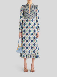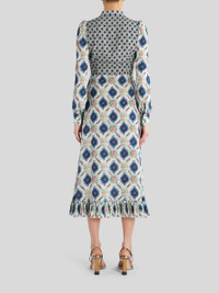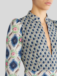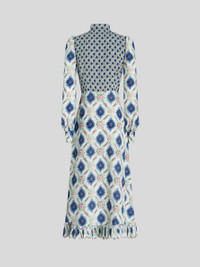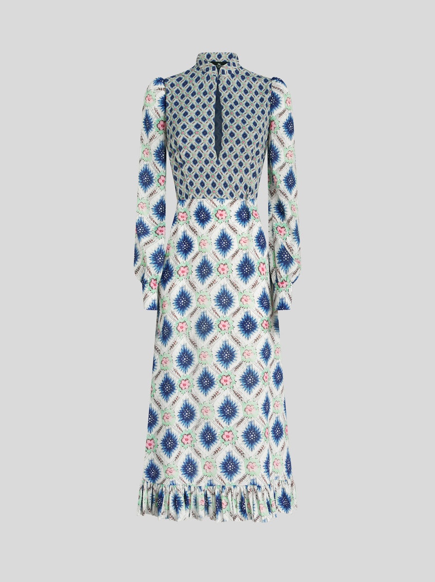 Sablé fabric midi dress featuring a teardrop neckline decorated with a geometric print with flowers and flounce at bottom. PRODUCT DETAILS • 98% polyester, 2% elastane • Interior: 100% silk • Mandarin collar with teardrop neckline • Puffed sleeves • Ankle length • Made in Italy • The model is 178 cm/70 inches tall and wears size 40