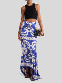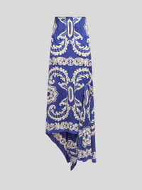 Skirt with snug fit at the sides and asymmetric tips. The item stands out for its glossy/matte marble-print background and the contrasting, placed stencil-like floral print. The item was presented at the Spring-Summer 25 Women's Runway Show. • Regular fit • High waist • Rear hook and zip closure • Made in Italy • The model is 5' 9½" (177 cm) tall and wears a size 40 PRODUCT DETAILS • 100% viscose